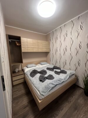 A hálóban egy kényelmes franciaágy található megágyazva, valamint egy ruhásszekrény. Az apartman saját 45 négyzetméteres füves teraszáról pedig csodálatos kilátás nyílik a Balatonra. A fürdőszobában található kád is segíthet ellazulni, azonban az épület saját wellness részlege erre sokkal alkalmasabb. Saját különálló konyhája jól felszerelt és minden eszköz megtalálható benne egy finom ebéd elkészítéséhez, melyet a nappalival egyben lévő étkezőben kényelmesen elfogyaszthatunk.